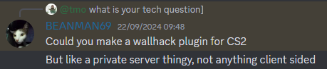 But i could certainly figure it out. After all, CS already has “glows” that allow you to see people through walls for spectating purposes and seeing your own teammates. What this man here wanted was to be able to “give” a single player wallhacks so that he could organize 1v5 matches where the single player has an advantage over the other team. Seems pretty doable: apply a glow to the team that is not the single player every round.