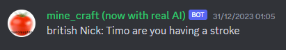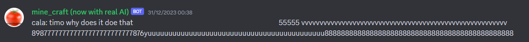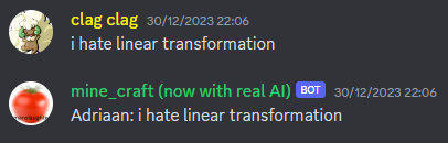 - Filter out specific channels a bit better! I completely forgot we had a counting channel, and at several points I got confused as to why the bot was spitting out numbers. I’d like to try again at some point later. For now it’s been fun. Learned a lot about how LLM’s work, and I’m pretty hopeful for where it’s all going.